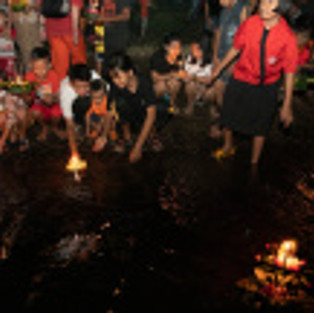 On that day, the children came back from school in a hurry, and quickly got busy making the Krathongs from banana tree trunks and folded banana leaves, crafted into a lotus shape and decorated with flowers, three incense sticks and a candle.
