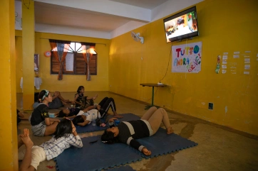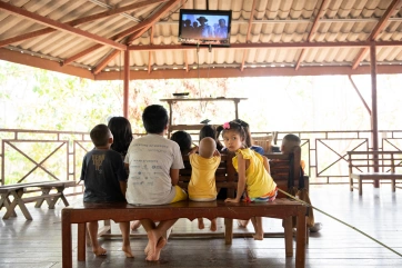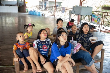 The children love to watch movies. It could be in the dining hall…