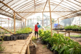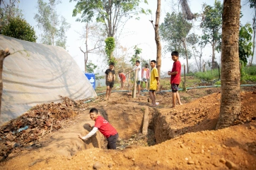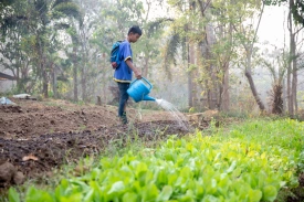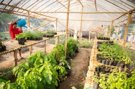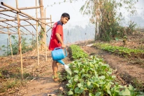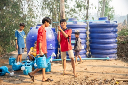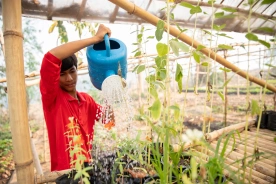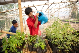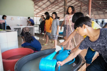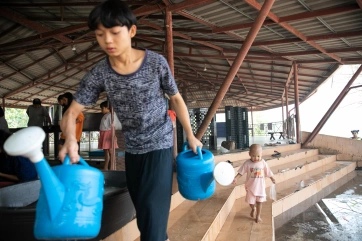 Watering the plants is a daily task, performed in the mornings and afternoons collectively. First, the children fill the watering cans from the water tanks, also recycling grey water from our “half baths” and dish washing.