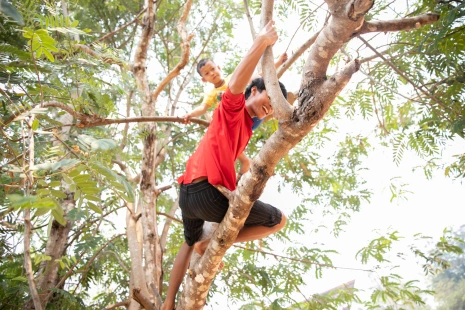 …he also loves climbing trees, especially to get those big jackfruit that hang up there! He climbs with a knife in his teeth like a pirate!
