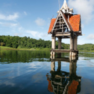The flood submerged the original town of Sangkhlaburi, of which only the “Sunken Temple” remains visible today, with its bell tower emerging in the middle of the lake.